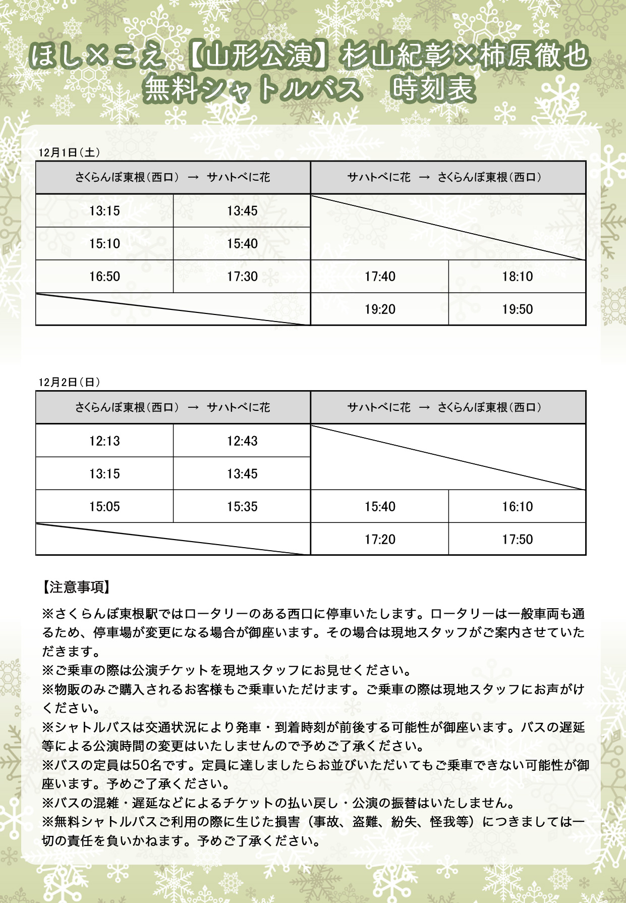 ※シャトルバスは交通状況により発車・到着時刻が前後する可能性が御座います。バスの遅延等による公演時間の変更はいたしませんので予めご了承ください。